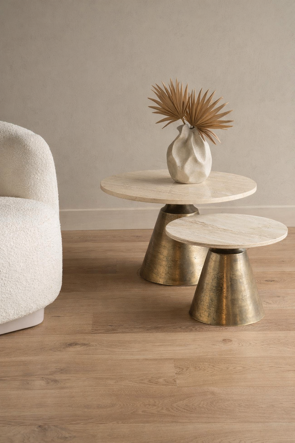 The natural travertine surface showcases subtle tonal variation and organic veining, ensuring each piece is unique. Its compact, round form makes it ideal as a standalone centrepiece or layered alongside larger seating arrangements, offering visual softness while maintaining strong structural impact.
