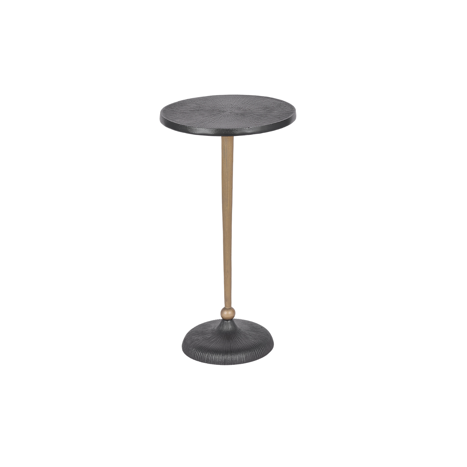 A sculptural etched-bronze pedestal side table crafted from aluminium with a grooved sunburst top and weighted base, offering a refined contemporary accent for classic and modern interiors.